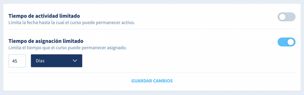 Puedes activar los cursos por períodos de tiempo, ya sea por una fecha hasta la cual quieres que el curso permanezca activo para todos los usuarios o por la cantidad de tiempo que cada estudiante tendrá acceso al curso a partir de su suscripción. En caso de desearlo, solo activa el botón de la opción que te convenga y establece la fecha o la duración.